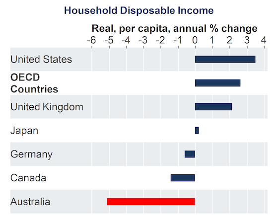 Household income data from the OECD showed that Australia had one of the lowest rates of annual real household disposable income per person compared to its OECD peers (see the chart below). Over the year to June, Australia’s real per capita household disposable income was down by 5.1%, compared to a 2.6% rise across OECD countries.