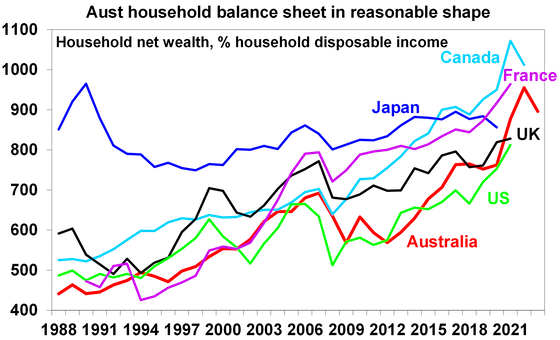 Australian household wealth as a share of household disposable income is at the top end of its OECD peers (see the chart below).