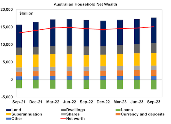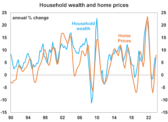 Around 70% of Australian household wealth is tied to the value of homes (which is made up of land and dwellings) and moves closely in line with home prices (see the chart below). Household wealth rose throughout 2023, in line with solid growth in home prices.