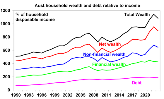 The Australian Bureau of Statistics estimates the value of a household’s assets, liabilities and therefore wealth. Net worth or wealth is calculated as a household’s total assets minus its liabilities. Total wealth is close to 11 times the size of household disposable income (or 1083%) and net wealth is 896% of income. The latest data for the year to June 2023 showed a slight fall in wealth as a share of income, after it reached a record high in 2022 – see the chart below. Non-financial wealth is worth 647% of income, larger than financial wealth at 436% and well surpassing household debt, which is 187% of income.