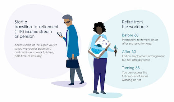 From age 60, you can leave your job (but not officially retire), and don’t have to make any declaration about your future employment intentions. You can access your super and, if you wish to at some point, return to work. However, any earnings or contributions accrued after you leave your job can’t be accessed until a fresh condition of release is met.