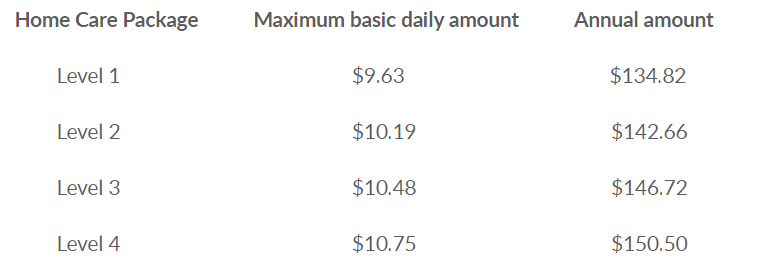 The Government contributes the following amounts to each person receiving a Home Care Package (20 September 2020 rates):