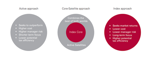 In essence, core-satellite is an investment approach that combines the benefits of index funds—lower cost, broader diversification, tax efficiency and lower volatility— with actively managed funds or other direct investments offering potential for outperformance.