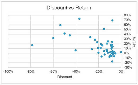 There has been a large range of returns on offer, with some top performers recording a 73% gain, a large number of stocks in the +10-40% range, and a handful which have underperformed the market. While the average discount has been around 20%, the range has been considerably wider.1