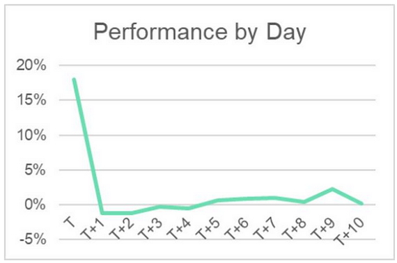 Within the 45 market-wide capital raisings that have taken place recently, we have observed a couple of interesting points relating to how stocks perform post-raising. Firstly, in the very short term, all the return for investors is made on the first day the stock resumes trading (point ‘T’ in the chart below). Performance then usually dips slightly as the new shares settle (generally two to four days later) and short-term holders looking for a quick profit exit the stock. See below graph.