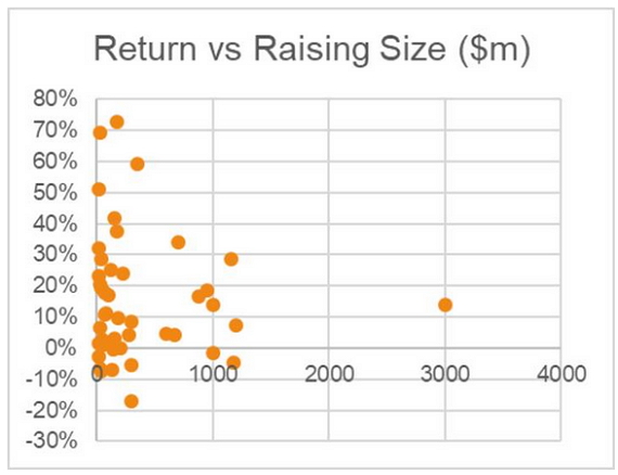 The chart below shows the relationship between discounts and returns, and it is interesting to note that every small cap company which has conducted a raising at a discount greater than the 20% average in March and April is showing a positive return.