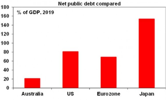 Third, Australia’s public debt is far lower than in other comparable countries. In fact, net public debt as a share of GDP is around a quarter of what it is in comparable advanced economies. See the next chart. So Australia has far greater scope to undertake fiscal stimulus than other comparable countries.