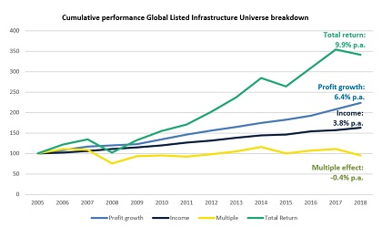 Long-term infrastructure investors should appreciate that the majority of short-term returns are driven by multiple expansion and contraction, but over the long term this has little impact. As seen in the chart below, profit growth for infrastructure companies has been consistently positive year on year. Years with negative total return have primarily been driven by multiple compression, despite positive profit growth.
