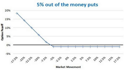 The put contract illustrated in the chart above has a strike price that is 5% below the market level. If the market falls by 10%, on the basis of the graph above, you will get a 6%return. The premium is 1.5%. If the market goes up or falls less than 5%, the option will expire worthless and you lose the premium.