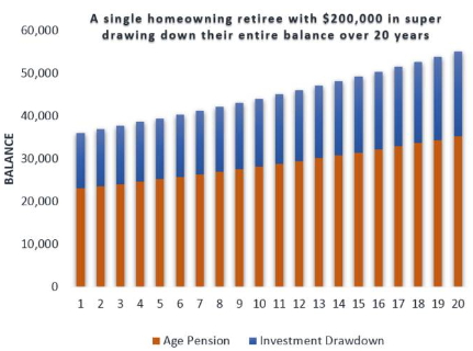 With the government Age Pension for a single homeowner currently worth $23,000 per year, that sum plus the cash flow from their investment increases their annual spending power to $36,000 per year – a significant 55 per cent increase in their annual income. This is illustrated in the chart below.