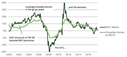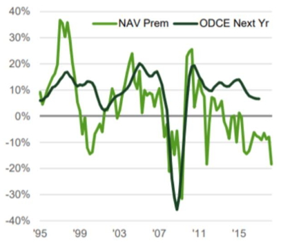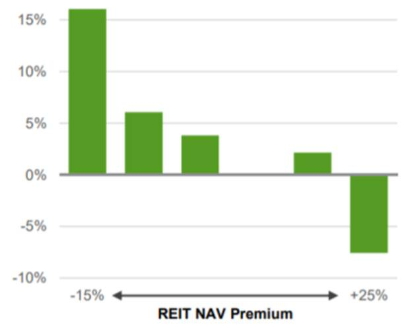 Put very simply, if a REIT trades at a premium to its NAV, the market believes its assets will appreciate above levels indicated by market pricing of the underlying direct real estate. The inverse occurs when trading at discounts.