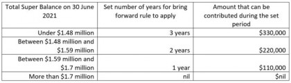 As an example, if a person has a total super balance of $1.3 million on 30 June 2021 and makes a non-concessional contribution of greater than $110,000 during the 2021/22 financial year, they will trigger the bring forward rule and can then contribute up to $330,000 at any time during the 2021/22, 2022/23 or 2023/24 financial years.