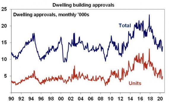 Weighing against each of these factors will be the effectiveness of the government’s HomeBuilder program, which was designed to stimulate residential construction, and which should benefit alterations and approvals construction in particular, which fell by 1.1% in July.