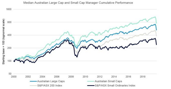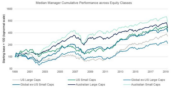 Past performance is not a reliable indicator of future performance. Source: eVestment, March 2020. Note: The chart shows the cumulative performance for the median US large cap manager, median US small cap manager, median Global ex-US large cap manager, median Global ex-US small cap manager, median Australian large cap manager and median Australian small cap manager, respectively.