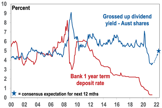 Finally, while traditional valuation measures for shares show them to be expensive, they continue to look okay relative to still low bond yields. This is particularly evident in Australia with a grossed-up dividend yield of 5% or so for the year ahead well above bank term deposit rates of around 0.5%.