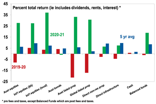 This drove very strong returns from balanced growth super funds of around 19% after fees and taxes. Over the last five years super fund returns averaged around 8.5% pa which is not bad given sub 2% bank deposit rates and inflation.