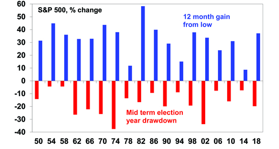 The US mid-term elections – mid-term election years normally see below average returns in US shares, and since 1950 have seen an average drawdown of 17%, albeit with an average 33% gain over the subsequent 12 months.