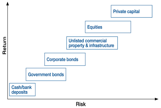 This chart is basic to investing. Each asset class has its own risk (in terms of volatility and risk of loss) and return characteristics. Put simply: the higher the risk of an asset, the higher the return you will likely achieve over the long term and vice versa. The next chart shows a stylised version of this. Starting with cash, it’s well known that its very low risk but so is its return potential. Government bonds usually offer higher returns but their value can move around a bit in the short term (although major developed countries have not defaulted on their bonds). Corporate debt has a higher return potential again but a higher risk of default. Unlisted or directly held commercial property and infrastructure offer a higher return again but they come with higher risk and are less liquid and can be less able to be diversified (except via say a managed fund). Equities can offer another step up in return, but this is because they come with higher risk as they are subject to share market volatility and individual companies can go bankrupt wiping out share holder capital. Beyond this, private equity entails more risk again & so tends to command an even higher return premium.