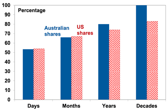 If you look at the daily movements in the share market, they are down almost as much as they are up, with only just over 50% of days seeing positive gains. See the next chart for Australian and US shares. So day by day, it’s pretty much a coin toss as to whether you will get good news or bad news. But if you only look monthly and allow for dividends, the historical experience tells us you will only get bad news around a third of the time. Looking only on a calendar year basis, data back to 1900 indicates the probability of a loss slides to just 20% in Australian shares and 26% for US shares. And if you go all the way out to once a decade, since 1900 positive returns have been seen 100% of the time for Australian shares and 82% for US shares.
