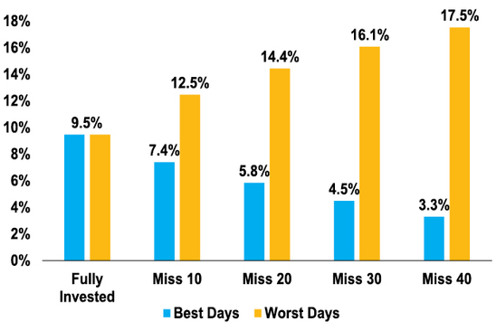 In times of uncertainty it’s tempting to try and time the market, ie to sell ahead of falls & buy in anticipation of gains. But without a proven asset allocation or stock picking process, trying to time the market is very difficult. A good way to demonstrate this is with a comparison of returns if an investor is fully invested in shares versus missing out on the best (or worst) days. The next chart shows that if you were fully invested in Australian shares from January 1995, you would have returned 9.5%pa (including dividends but not allowing for franking credits, tax and fees).