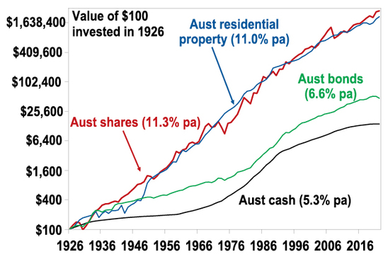 Again it can be seen that over very long periods the power of compounding works wonders for shares compared to bonds and cash. But it can also be seen to work well for Australian residential property with an average total return (capital growth plus net rental income) of 11% pa, which is similar to that for shares. All of which highlights, along with the diversification benefits of a real asset like property, the case to have it in a well-diversified portfolio along with listed assets like shares, bonds and cash.