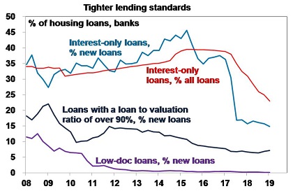Headlines of excessive mortgage stress have been common for over a decade now. There is no denying housing affordability is poor, household debt is high and some households are suffering significant mortgage stress. But most borrowers appear to be able to service their mortgages. And despite some seeing negative equity and a significant proportion of borrowers switching from interest only to principle & interest loans (which has seen interest only loans drop from nearly 40% of all loans to 23%) there has been no surge in forced sales and non-performing loans. Non-performing mortgages have increased but remain low at around 0.9%. While Australia saw a deterioration in lending standards with the last boom, it was nothing like other countries saw prior to the GFC. Much of the increase in debt has gone to older, wealthier Australians, who are better able to service their loans. Low doc loans are trivial in Australia and the proportion of high loan to valuation ratio loans has fallen as has the proportion of interest only loans.