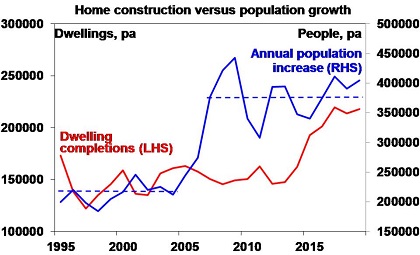 Annual population growth since mid-last decade has averaged 373,000 people compared to 217,000 over the decade to 2005, which requires roughly an extra 75,000 homes per year. Unfortunately, the supply of dwellings did not keep pace with the population surge (see the next chart) so a massive shortfall built up driving high home prices. Thanks to the surge in unit supply since 2015 this is now being worked off, but it follows more than a decade of accumulated undersupply which is the main reason why housing has remained relatively expensive in Australia. Not tax breaks or low rates – all of which exist in other countries with far more affordable housing!