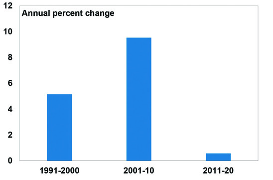 • Growth in real business investment growth fell from 5% pa in the 1990s and 9.5% pa in the 2000s to just 0.6% pa in the 2010s and the last 15-20 years have seen declines in research and development investment as a share of GDP.