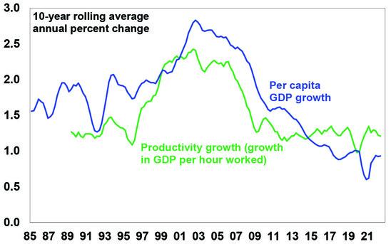 As can be seen in the last chart, the longer-term pattern in labour productivity growth has correlated with a similar pattern in growth in GDP per capita (or GDP per person). Roughly speaking the slowdown in productivity growth from 2.2% pa in the 1990s to 1.2% pa over the last ten years means that after a 10-year period annual GDP will be 9% (or $300bn less in today’s dollars) than would otherwise have been the case, which means much lower average material living standards compared to what otherwise could have happened. Of course, we can make up for the drag on GDP growth by growing the population faster as has been the case since the mid-2000s but this does not address the negative impact on material living standards per person. Lower productivity growth translates to lower real wages growth, slower growth in profits and a reduced ability for the government to provide services that the community expects without taking on more debt.