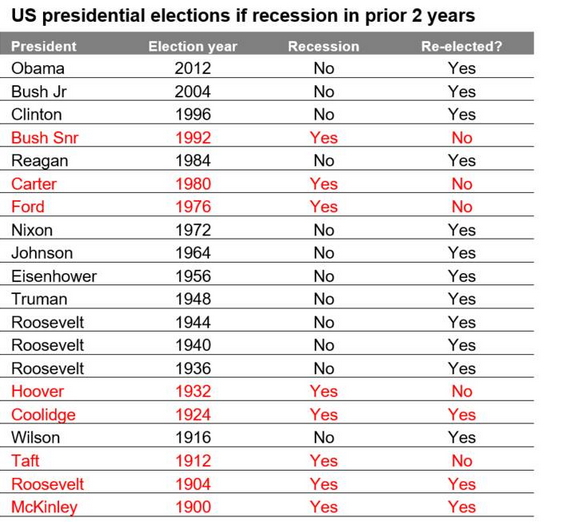 History indicates incumbent presidents tend to lose when there is a recession in the two years before the election.