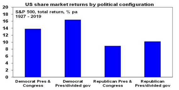 Finally, historically US shares have done best under Democrat presidents with an average return of 14.6% pa since 1927 compared to an average return under Republican presidents of 9.8% pa. The best average result (16.4% pa) has actually occurred when there has been a Democrat president and Republican control of the House, the Senate or both.