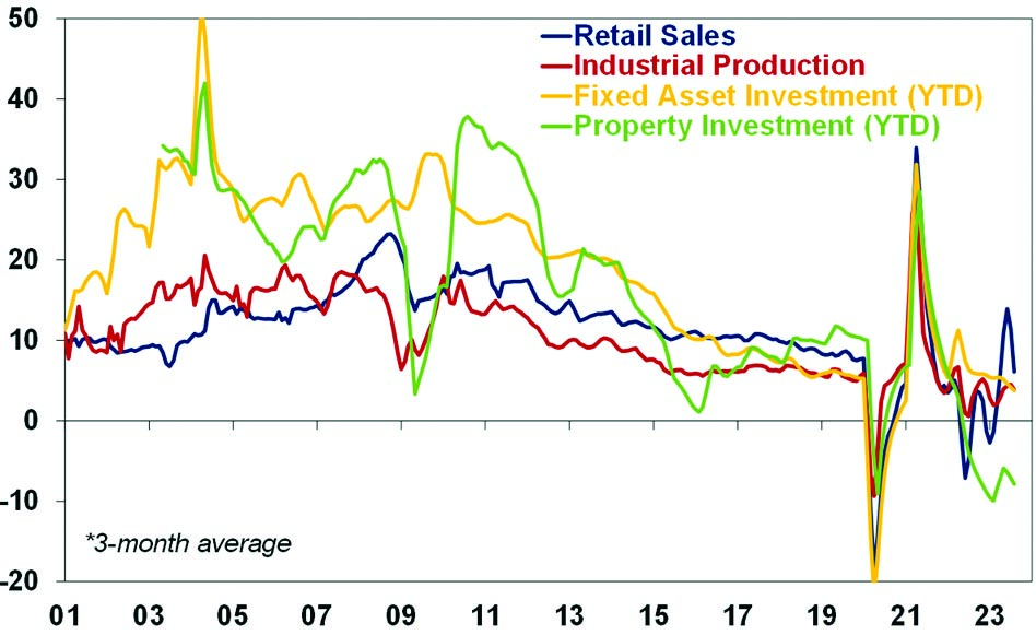As a result of China’s falling workforce and slowing productivity growth, estimates of its potential real GDP growth have fallen from around 10% in 2006-10 to around 5% now and around 3% next decade.