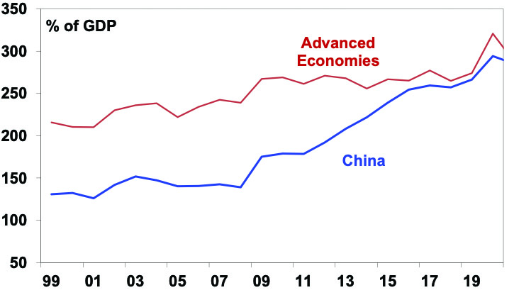 • The first thing to note is that China has a very high saving rate of around 45% of GDP, which is roughly double that of countries like Australia. This makes China’s debt problems very different to other countries as China has borrowed from itself (so there are no foreigners to cause a foreign exchange crisis). But it means the savings have to be recycled (usually via debt) into demand or else weak demand, high unemployment and chronic deflation can result. It did this initially through corporate debt into investment and then into property which has resulted in a rapid rise in China’s debt levels since 2008. But this is getting problematic.