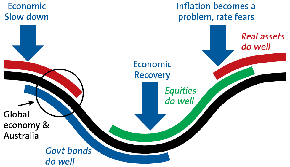 Bonds do well in the economic downturn phase as interest rates fall and when inflation is still falling. Shares tend to lead the economic recovery as they respond first to easy money and as far-sighted investors sniff out recovery and continue doing well as profits rise before coming under pressure from eventual interest rate hikes & fears of a new downturn. Real assets tend to do relatively well later in the cycle as: it takes longer for easy money to flow into them; the valuation process results in a lag; & they tend to move more with current economic conditions which drives rents. This benefitted unlisted commercial property returns in 2021-22. However, the investment cycle is now turning against commercial property with interest rates up sharply and economic growth slowing. The slump last year and ongoing volatility in share markets has at least partly anticipated this with commercial property starting to follow with a lag.