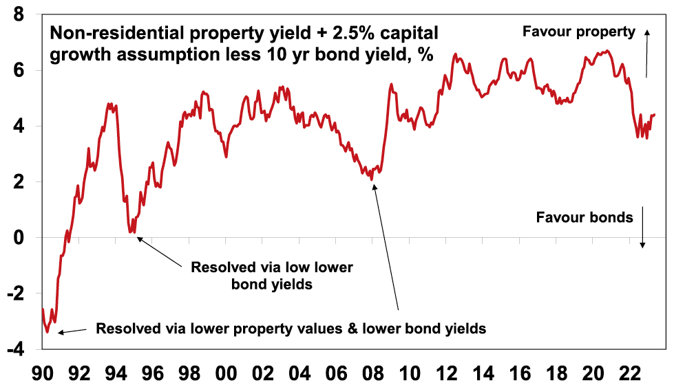 It assumes that rental and capital growth will average 2.5% pa over time (ie, in line with targeted inflation) and adds this to the average unlisted non-residential property yield to give a guide to potential total returns. The 10-year bond yield has been subtracted to show a property risk premium. Despite the collapse in property yields in late 2020 it reached a record high of more than 6.7% thanks to plunging bond yields at the time below 1%. Since then, the rise in bond yields has seen the risk premium plunge to levels not seen since the 2000s, but at around 4% it’s still relatively high. But there are two threats here. The first is if bond yields continue to rise reversing the yield chasing investor flows that commercial property has benefitted from over many years. And even if bond yields don’t rise further there is a risk that the reduced property risk premium may not be enough to keep investors happy given the outlook for deteriorating leasing conditions ahead.
