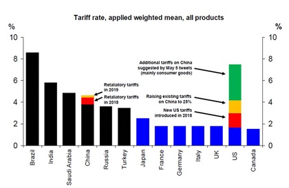 However, following May 5 tweets by Trump, on May 10 the delayed tariff hike from 10% to 25% on $US200bn of imports from China was put in place and the US kicked off a process to tariff the remaining roughly $US300bn of imports from China at 25%. If fully implemented this would take the average US tariff rate on imports to around 7.5%, which is significant (albeit minor compared to the 20% 1930 tariff hikes). See next chart.