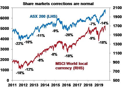 First, periodic sharp setbacks in share markets are healthy and normal as can be seen in the next chart. The setbacks are the price we pay for the higher long-term return from shares. After 25% or so gains from their lows, last December shares were at risk of a correction.