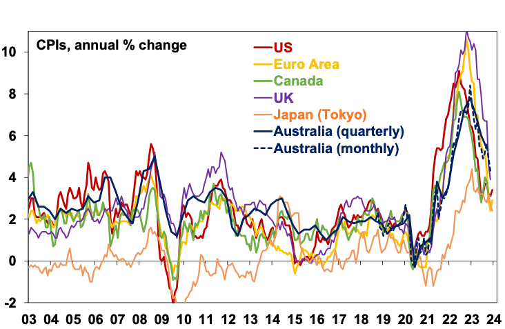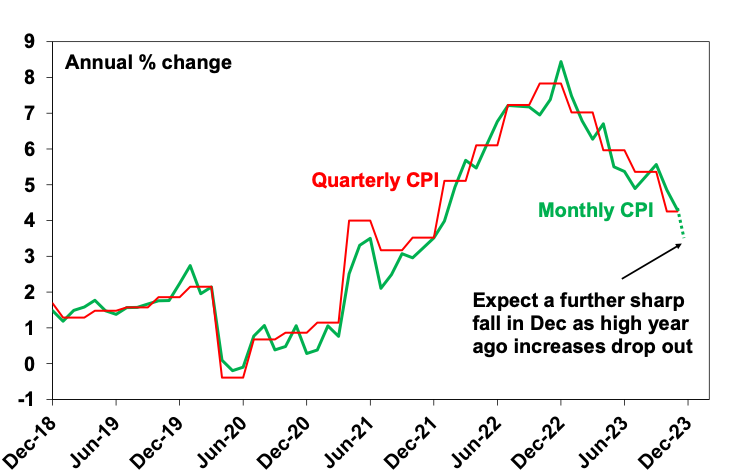 While there has been some angst about Australian inflation (at 4.3%yoy in November) being higher than that in the US (3.4%), Canada (3.1%), UK (3.9%) and Europe (2.9%) this mainly reflects the fact that it lagged on the way up and lagged by around 3 to 6 months at the top. The lag partly reflects the slower reopening from the pandemic in Australia and the slower pass through of higher electricity prices. So we saw inflation peak in December 2022, whereas the US, for instance, peaked in June 2022. But just as it lagged on the way up it’s still following other countries down with roughly the same lag. In fact, with a very high 1.5% mom implied rise in the Monthly CPI Indicator to drop out from December last year, monthly CPI inflation is likely to have dropped to around 3.3 to 3.7%yoy in December last year, which is more in line with other countries.
