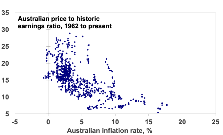 High inflation tends to be bad for investment markets because it means: higher interest rates; higher economic uncertainty; and for shares, a reduced quality of earnings. All of which means that shares tend to trade on lower price to earnings multiples when inflation is high, and growth assets trade on higher income yields. We saw this in 2022 with bond yields surging, share markets falling and other growth assets pressured.