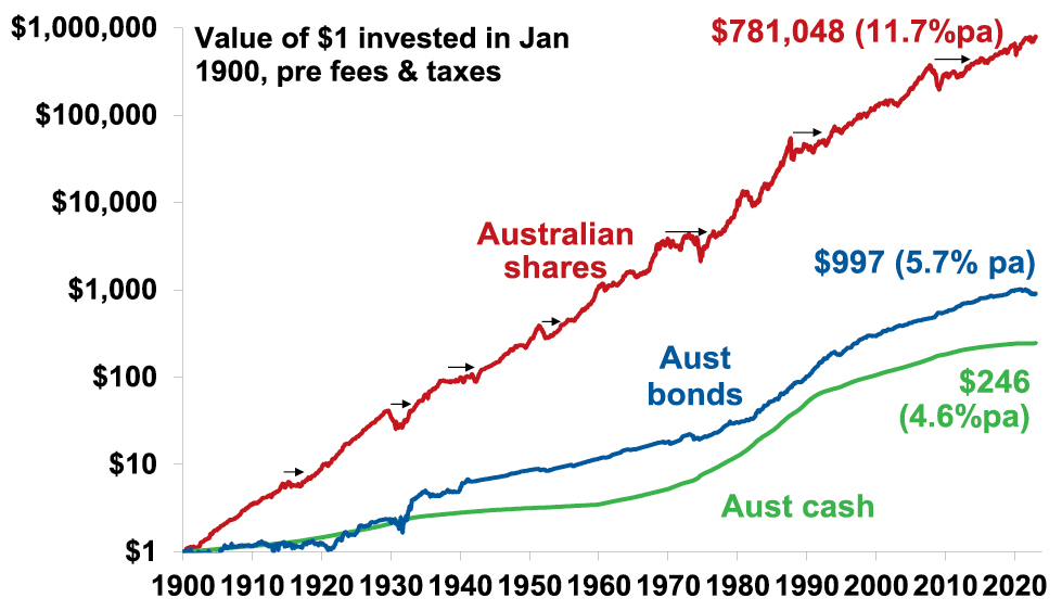 Key message: to grow our wealth, we must have exposure to growth assets like shares and property. While shares and property have had a rough ride over the last year as interest rates surged, history shows that both will likely do well over the long-term.