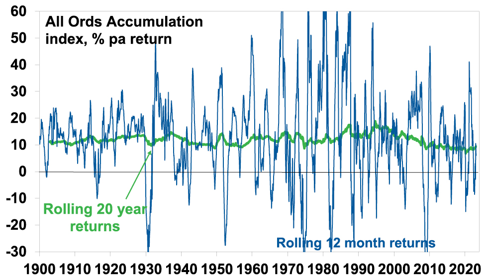 The trouble is that shares can have lots of (often severe) setbacks along the way as is evident during the periods highlighted by the arrows on the previous chart. Even annual returns in the share market are highly volatile, but longer-term returns tend to be solid and relatively smooth, as can be seen in the next chart. Since 1900, for Australian shares roughly two years out of ten have had negative returns but there are no negative returns over rolling 20-year periods.