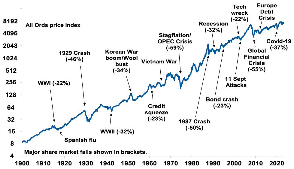 There is always something for investors to worry about it seems. And in a world where social media is competing intensely with old media it all seems more magnified and worrying. This is arguably evident again now in relation to uncertainty about inflation, interest rates and associated recessions risks. The global economy has had plenty of worries over the last century, but it got over them with Australian shares returning 11.7% per annum since 1900, with a broad rising trend in the All Ords price index as can be seen in the next chart, and US shares returning 9.9% pa. (Note that this chart shows the All Ords share price index whereas the first chart shows the value of $1 invested in the All Ords accumulation index, which allows for changes in share prices and dividends.)