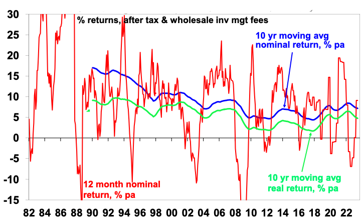 After allowing for taxes and fees this still implies pretty constrained nominal medium term returns for balanced growth super funds based on a traditional mix of assets of 5.5% pa which is a bit below the average since 2000. This is still better than bank term deposit rates which average up to 4.5% before taxes, and makes no allowance for any value added from active investment management.