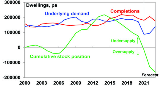 The cumulative stock position shows the accumulated gap between underlying demand & completions from when the market was roughly balanced. Source: ABS, AMP Capital