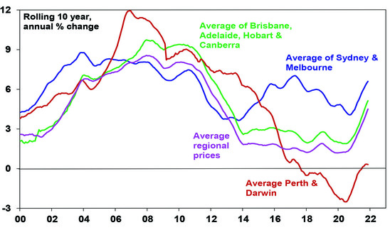 First, with Sydney and Melbourne home prices having led the charge over the last decade (see the next chart) and suffering from worse affordability, they are likely to come in a bit weaker than average over the next two years. Whereas laggard cities like Brisbane and Adelaide and possibly Perth and Darwin are likely to be relative outperformers. Regional prices may also continue to benefit from the work from home phenomenon and desire for a better lifestyle.