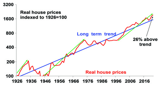 First – worsening affordability is constraining more buyers. Affordability has long been an issue in the Australian property market. The next chart shows real Australian home prices (average property prices after removing increases in consumer price inflation) indexed to start in 1926 at 100 (the red line) against their long-term trend (the blue line).