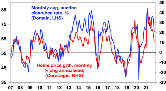 With national average home prices up by 20.9% year to date they are on track for a 22% rise this year. Prices in Sydney are up 25% year to date and are likely to be up by 26% this year. However, as noted earlier, this masks a sharp loss of momentum since March as a result of worsening affordability, rising supply, rising rates, macro prudential tightening and some eventual rotation in spending away from housing. We expect a further slowing in home price gains to 5% in 2022, with prices likely to start falling from around September/October next year resulting in a 5 to 10% decline in prices in 2023.