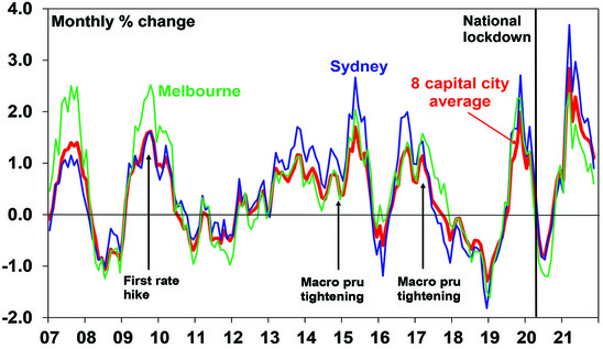 However, while the surge in prices has been big, the puff is coming out of the property market. Average dwelling price growth peaked at 2.8%mom in March and has slowed to 1.3%mom in November. Price growth in Sydney has slowed to 0.9%mom and in Melbourne to 0.6%mom. See the next chart.