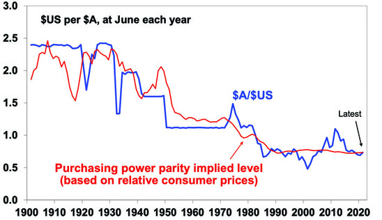 From a long-term perspective the $A is around fair value. The best guide to this is what is called purchasing power parity (PPP) according to which exchange rates should equilibrate the price of a basket of goods and services across countries – see the next chart that shows annual data for the $A back to 1900.