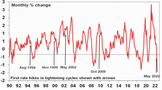 For these reasons, our assessment remains that the RBA won’t need to raise the cash rate above 3% and that the peak will be around 2.6% either later this year or early next. By late next year rates are likely to be falling. This implies a slowing in the pace of rate hikes ahead which should help head off worst case scenarios for the property market and the economy.